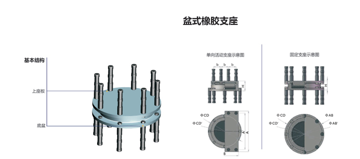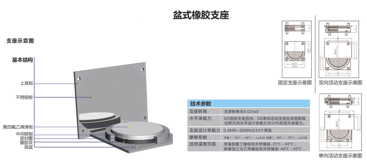 和欧洲标准EN1337的规定进行设计。 产品性能 结构紧凑、承载能力大、摩擦系数小、滑转自如。 应用领域 盆式橡胶支座其承载力高、